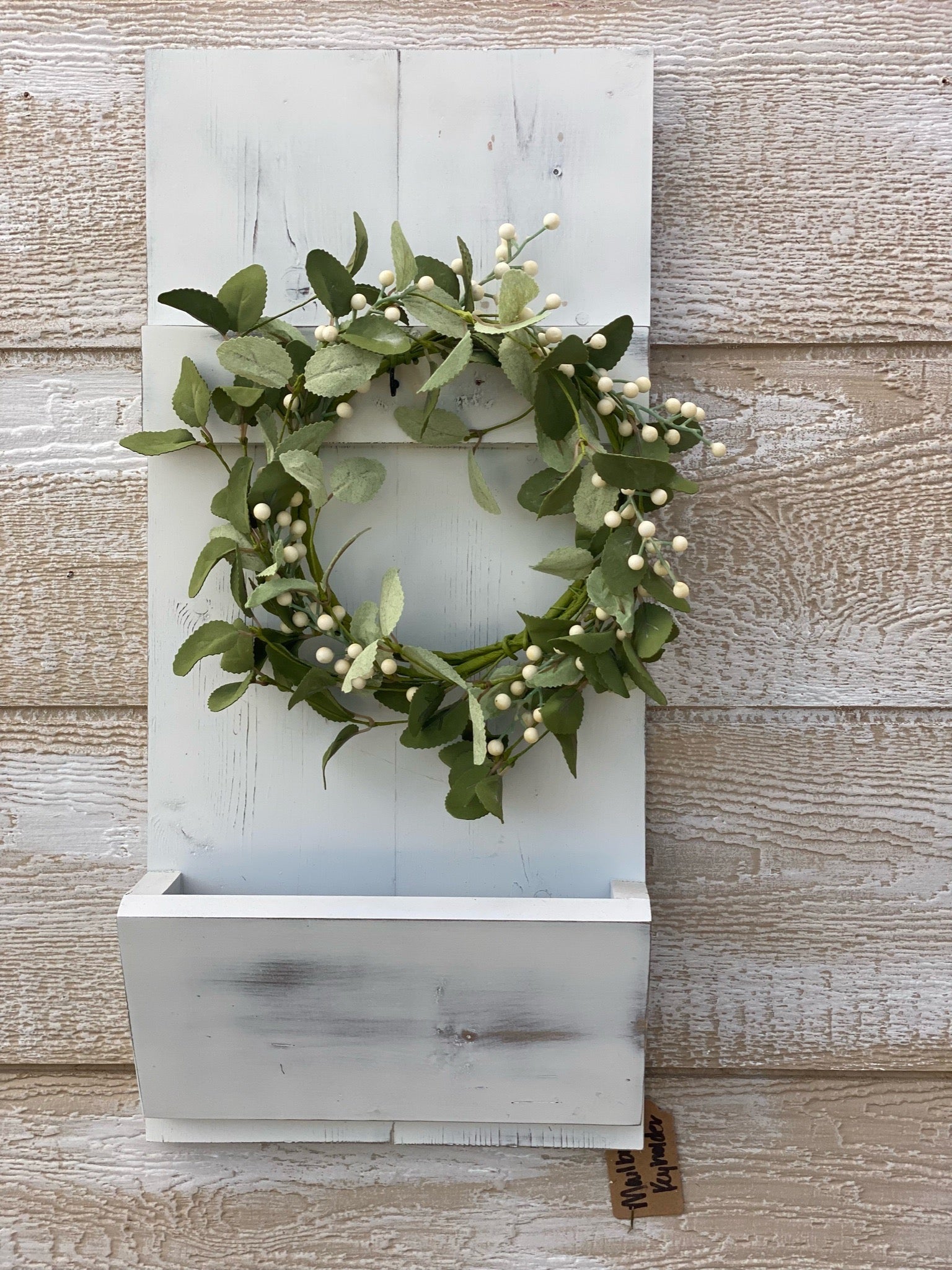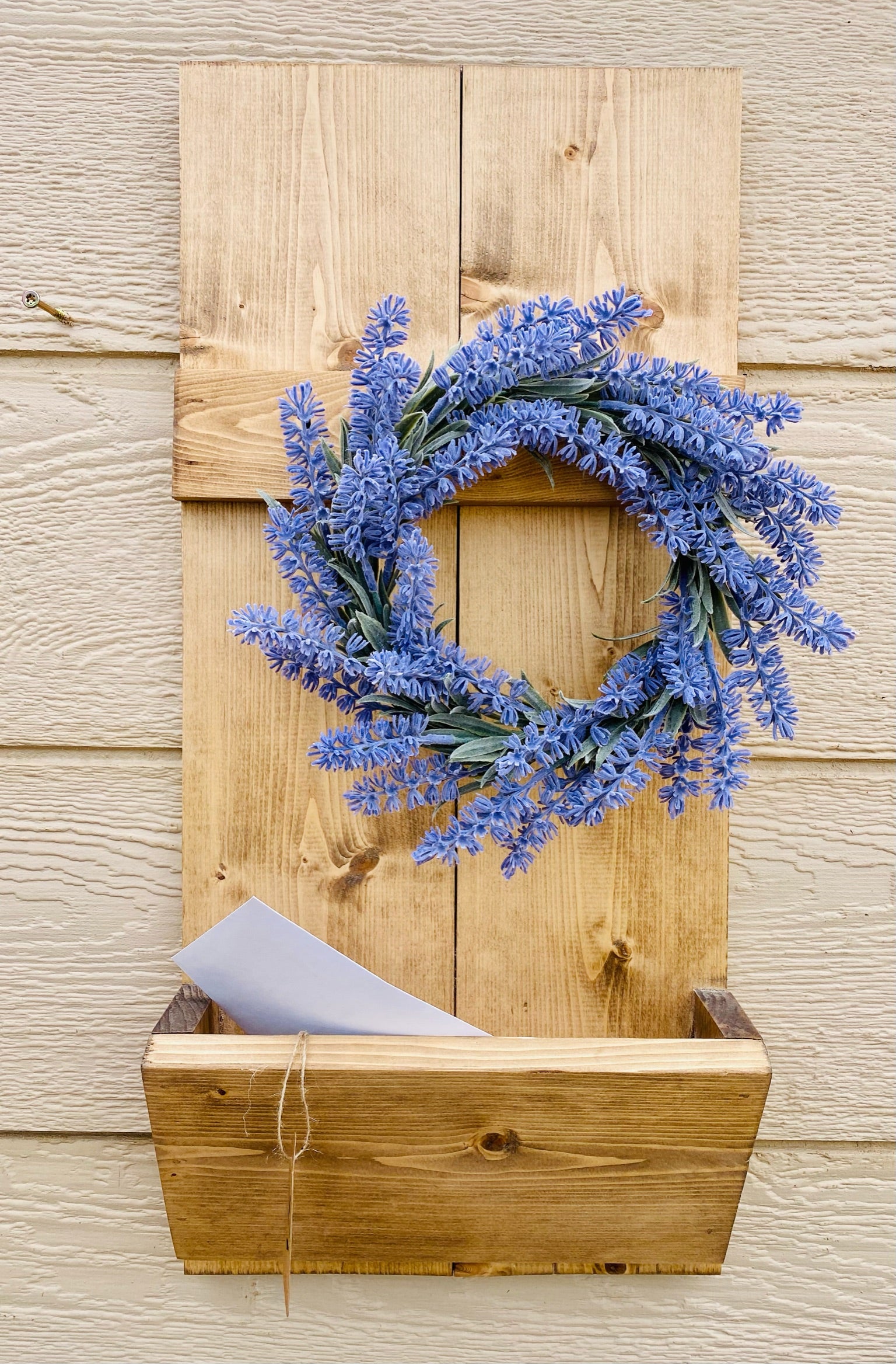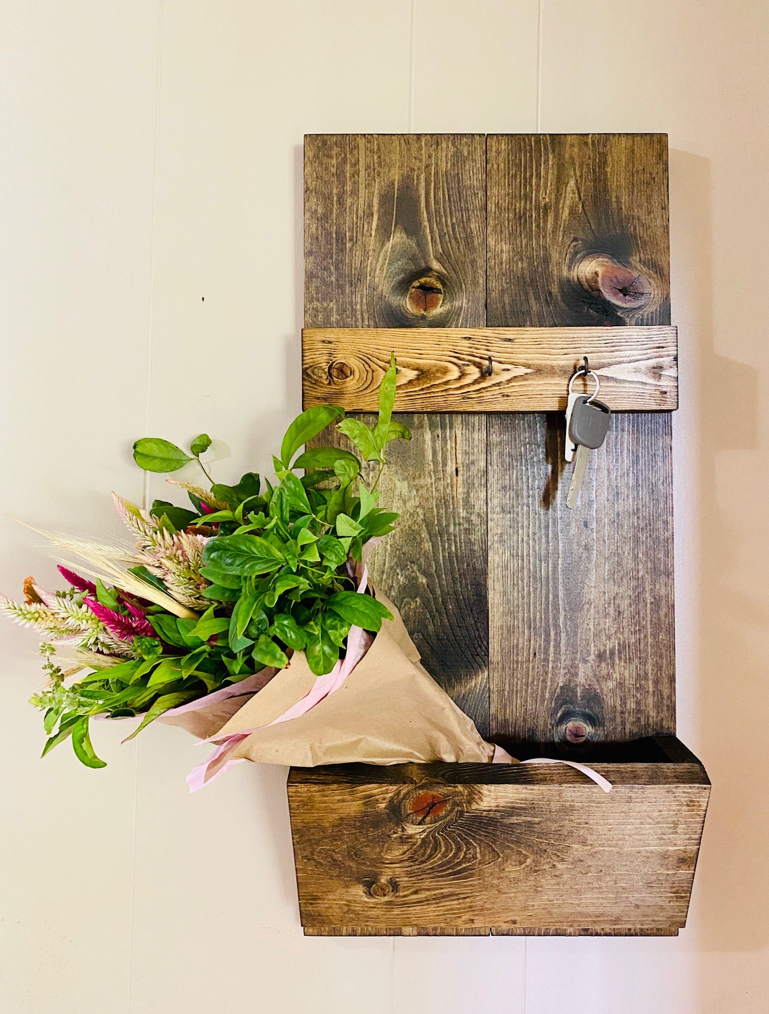 Keep your most important items organized and put away in your own farmhouse mail and key organizer. Each mail and key organizer has three hooks for hanging and a pocket for mail. Complete with a wall hanger, it's the perfect addition to your entryway.